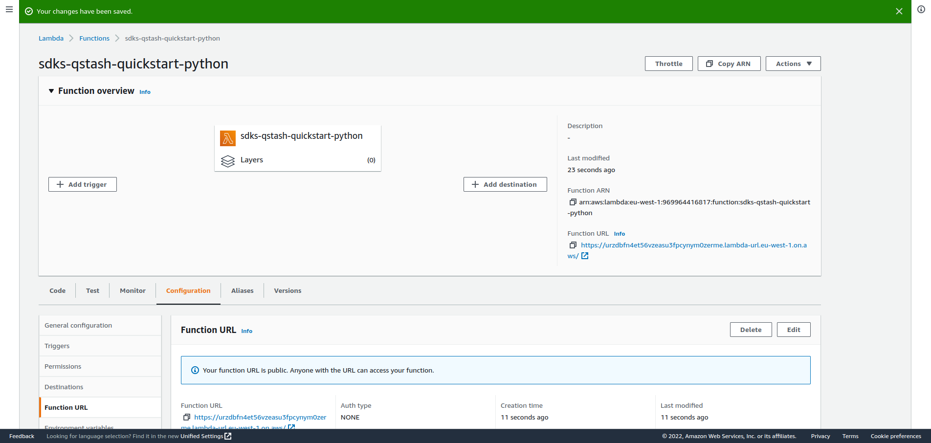 Afterwards we will add a public URL to this lambda by going to the Configuration tab:
